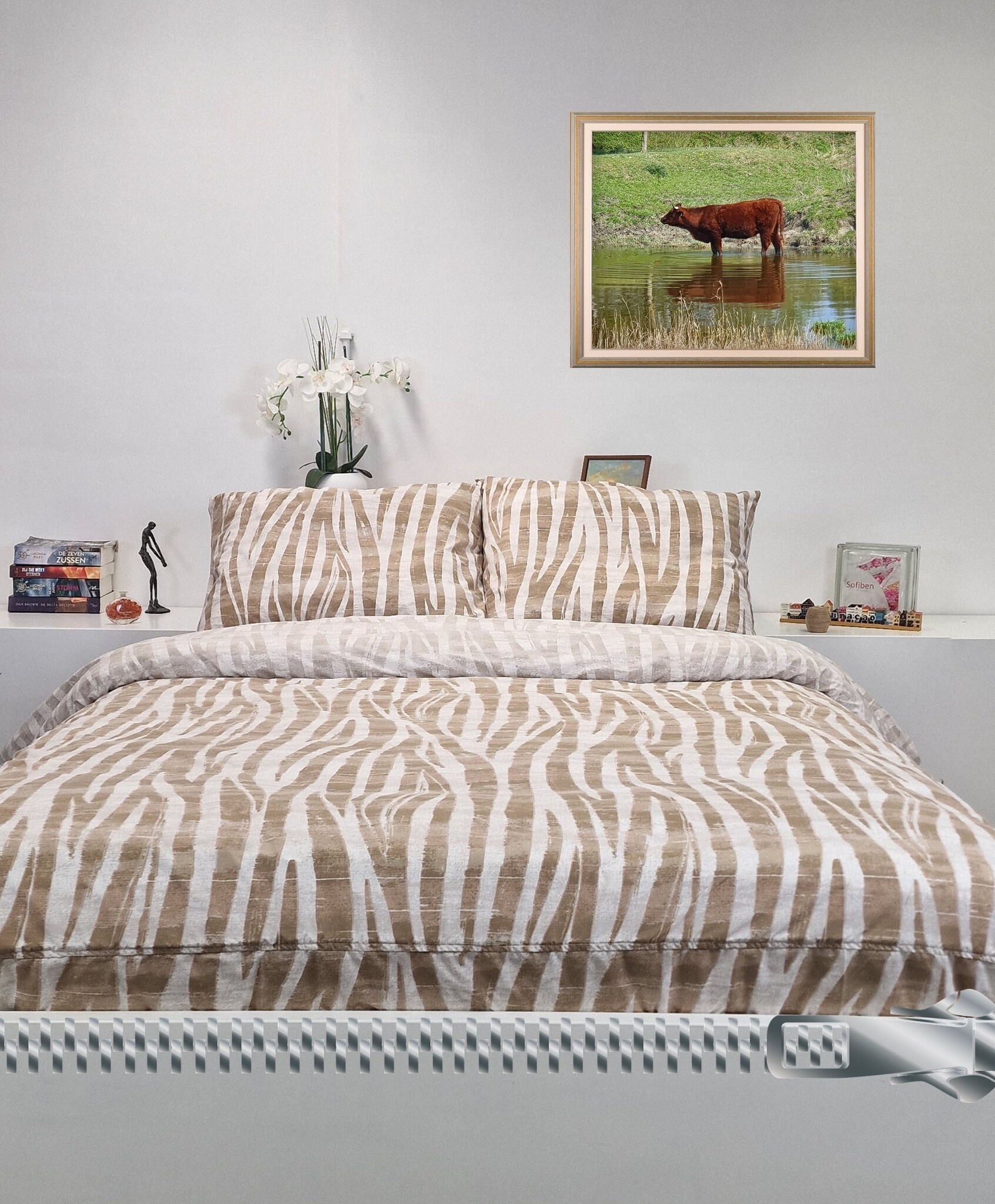 Dit dekbedovertrek is zowel aan de boven als onderzijde gemaakt van de stof van de onderzijde. Deze is lichter van kleur met een minder duidelijke tekening. Uiteraard is ook het dekbedovertrek voorzien van een doorlopende rits over 3 zijden.