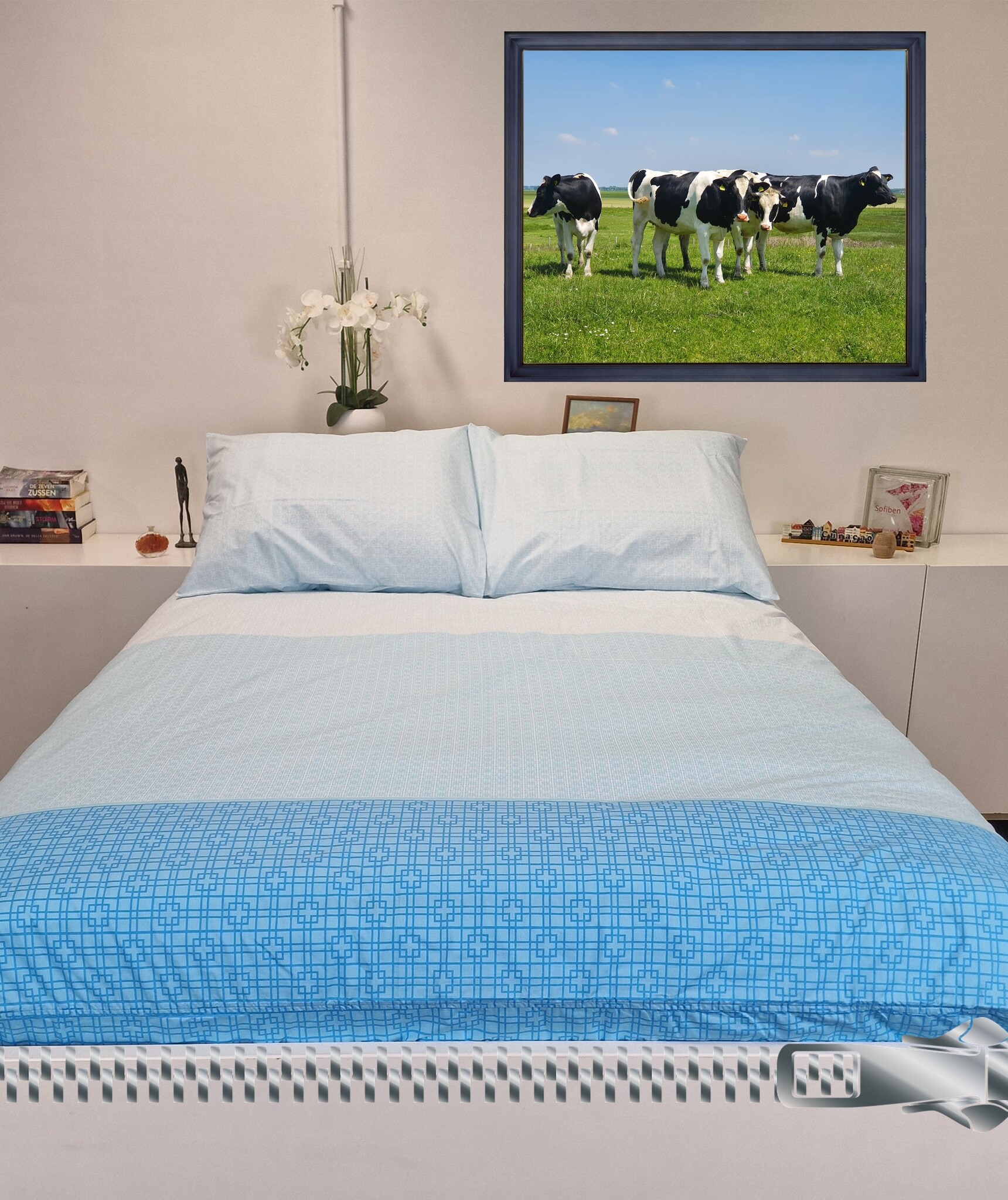 De onderzijde van het dekbedovertrek is uitgevoerd in heel lichtblauw met daarop witte blokjes en streepjes.