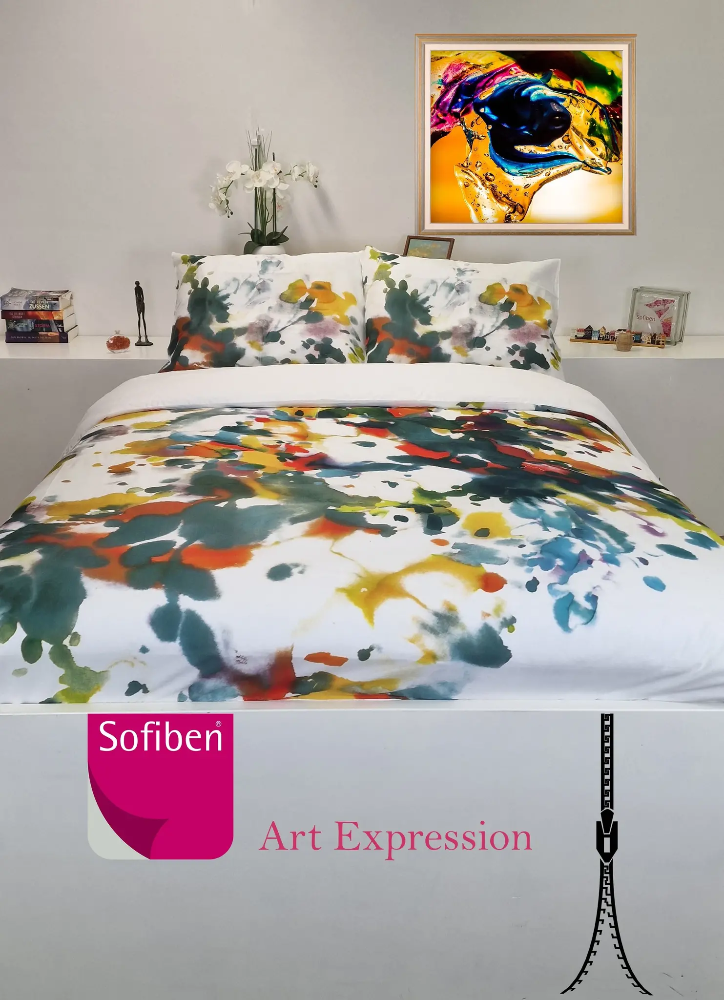 De basiskleur van het dekbedovertrek is wit. De bovenzijde van het dekbedovertrek is een abstracte weergave van takken en bladeren in een explosie van kleuren.
