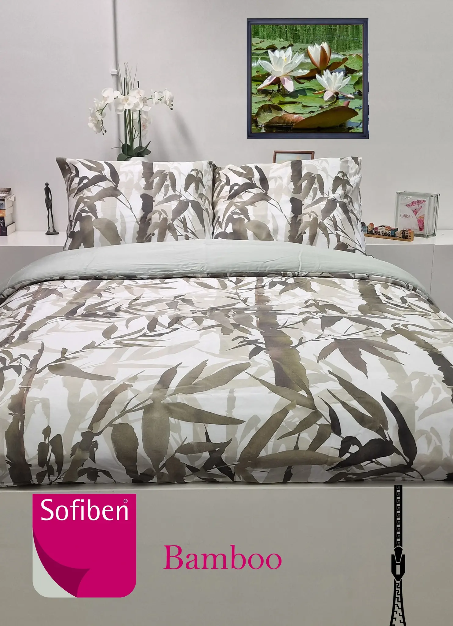 De basiskleur van het dekbedovertrek is grijs/groen. De bovenzijde van het dekbedovertrek is uitgevoerd in verticale bamboe takken en bladeren in verschillende tinten groen.