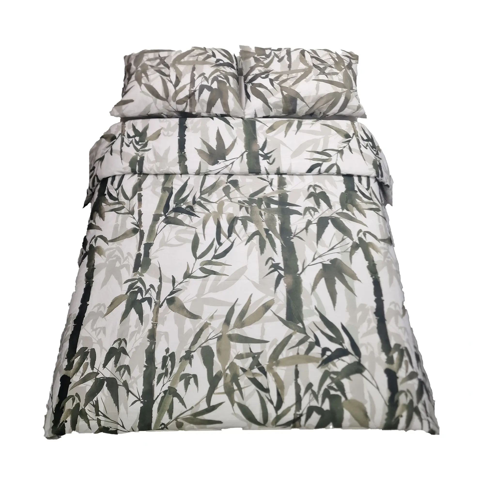 De basiskleur van het dekbedovertrek is grijs/groen. De bovenzijde van het dekbedovertrek is uitgevoerd in verticale bamboe takken en bladeren in verschillende tinten groen. Het dessin is opgebracht door middel van Digital Printing wat de tekening van het dessin positief beïnvloed en goed is voor mens en milieu.