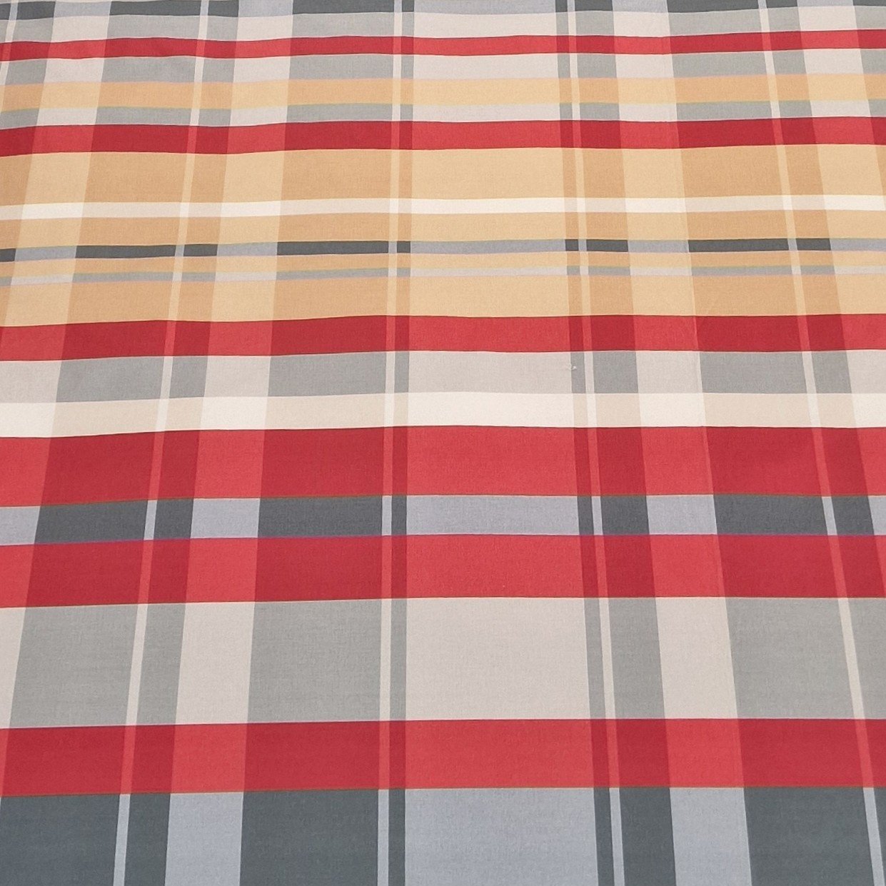 De bovenzijde bestaat uit vierkante blokken en de door elkaar lopende brede horizontale en verticale strepen in de kleuren rood, ecru beige en grijs. De combinatie van de vormen en kleuren geeft een vrolijke, maar toch klassieke uitstraling.