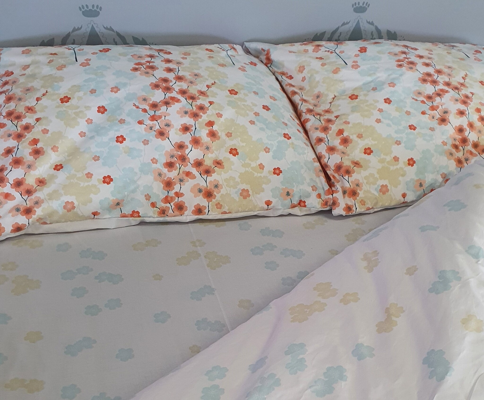 De ontwerper van dit dessin heeft de mooie takken van de prunus of een Japanse kers gebruikt om er een schitterend dekbedovertrek van de maken. Van de resterende stof van de onderzijde hebben we enkele dekbedovertrekken gemaakt. Het dessin is overwegend effen wit met daarop kleine lichtblauwe en beige bloemen
