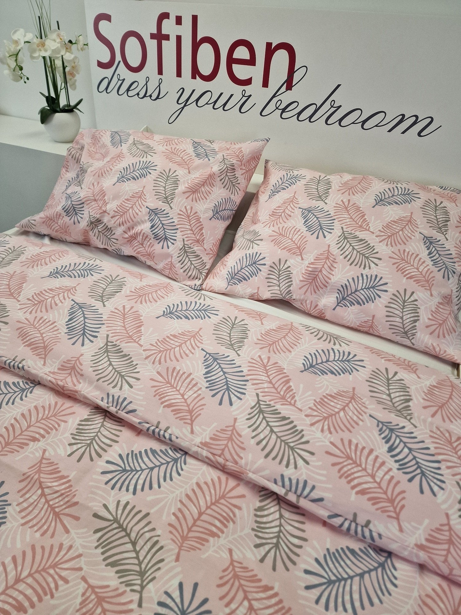 Dit dekbedovertrek, voorzien van de doorlopende rits over drie zijden, is gemaakt in een lichtroze basiskleur. Op het dessin zijn de bladeren van de varenplanten afgebeeld in de kleuren wit, taupe, blauw en donkerroze. De verschillende kleuren van de bladeren geven een speels en zomers effect.