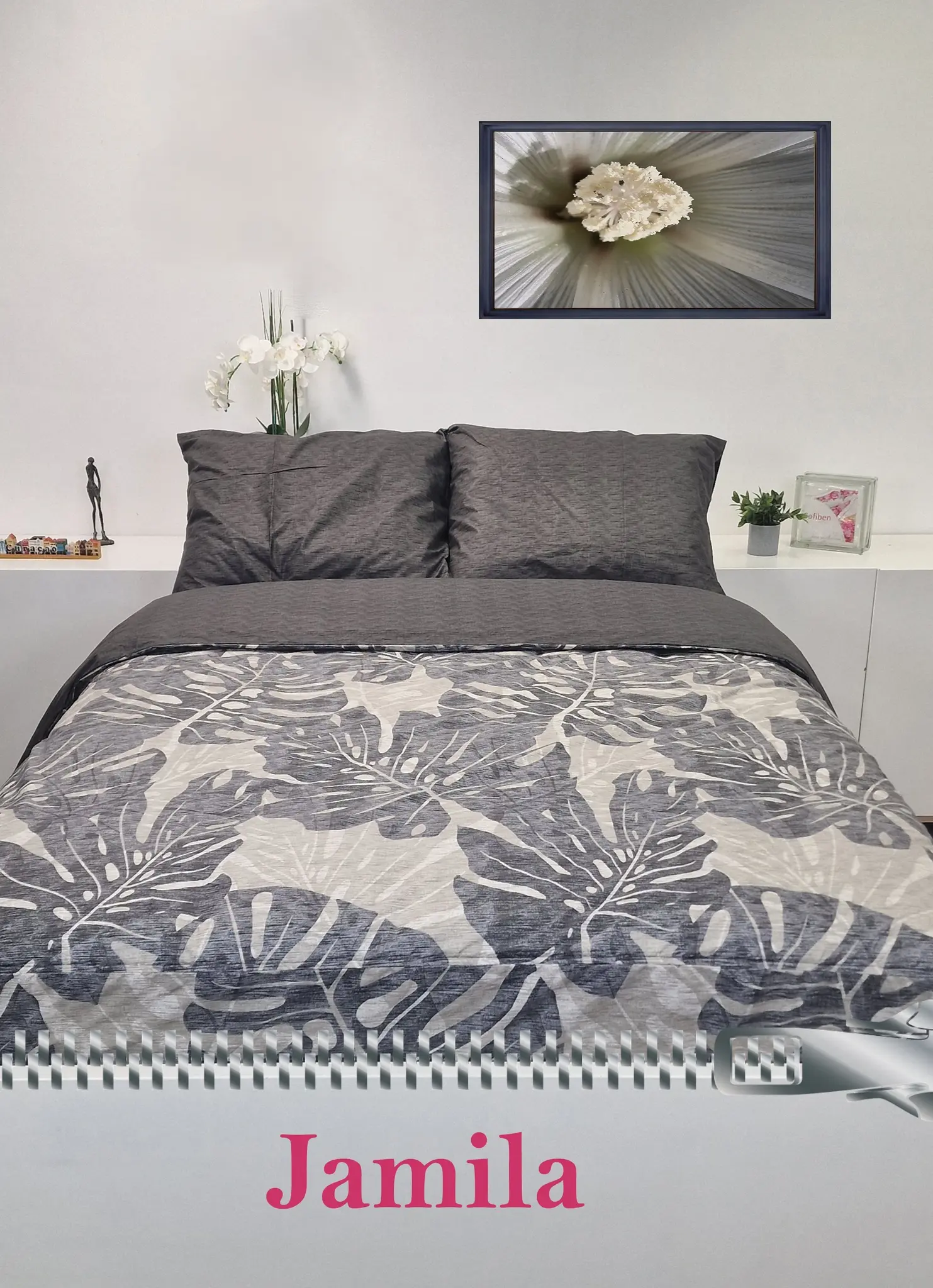 Het dessin Jamila is een prachtig dessin. Het dessin zijn bladeren van de gatenplant en zijn subtiel op de stof geverfd. De kleurstelling is verschillende kleuren grijstinten en zwart