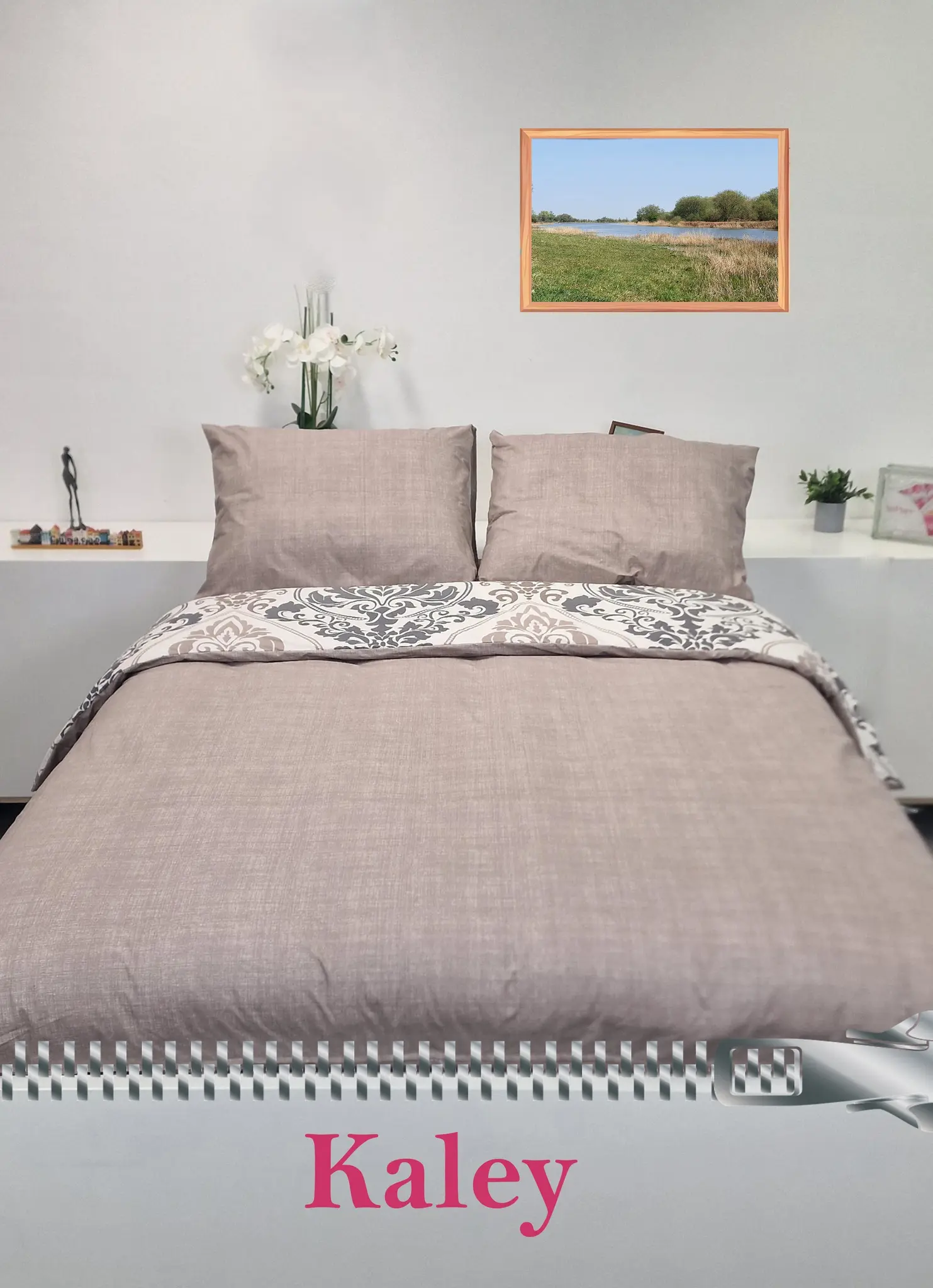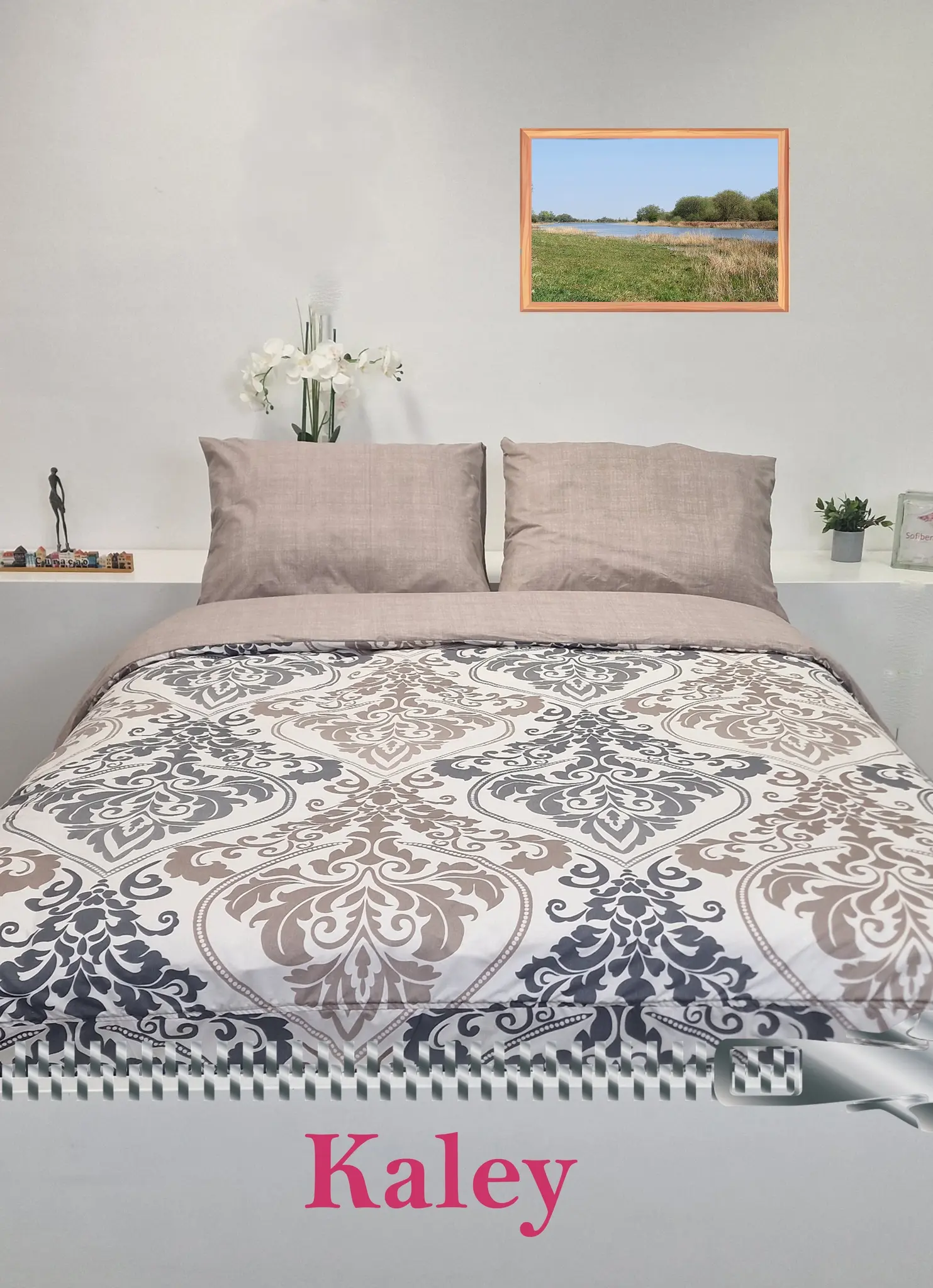 Het dessin Kaley is een klassiek dessin, waarvoor een brede belangstelling is. Het dessin bestaat uit een soort Franse Lelie omlijst door een ovaalvormige figuur in de kleuren donkergrijs en lichtbruine kleur op een ecru achtergrond.