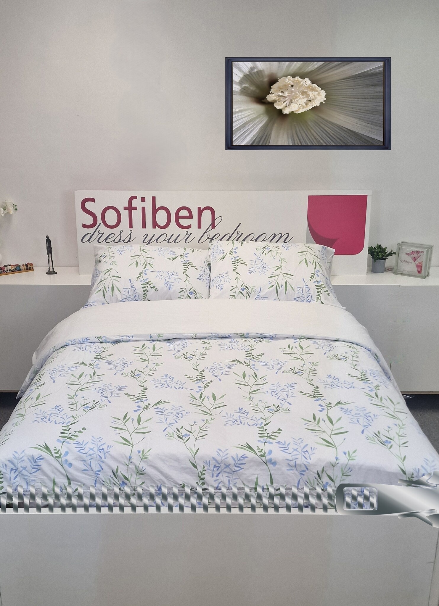 Het Sofiben dekbedovertrek Lindsey Blue heeft aan de bovenzijde een dessin van fijne takken in groene en blauwe tinten met kleine korenblauwe bloemknoppen op een offwhite ondergrond. De onderzijde is effen wit. De naam Lindsey betekent beeldschoon en is zeker van toepassing op dit smaakvolle dekbedovertrek.