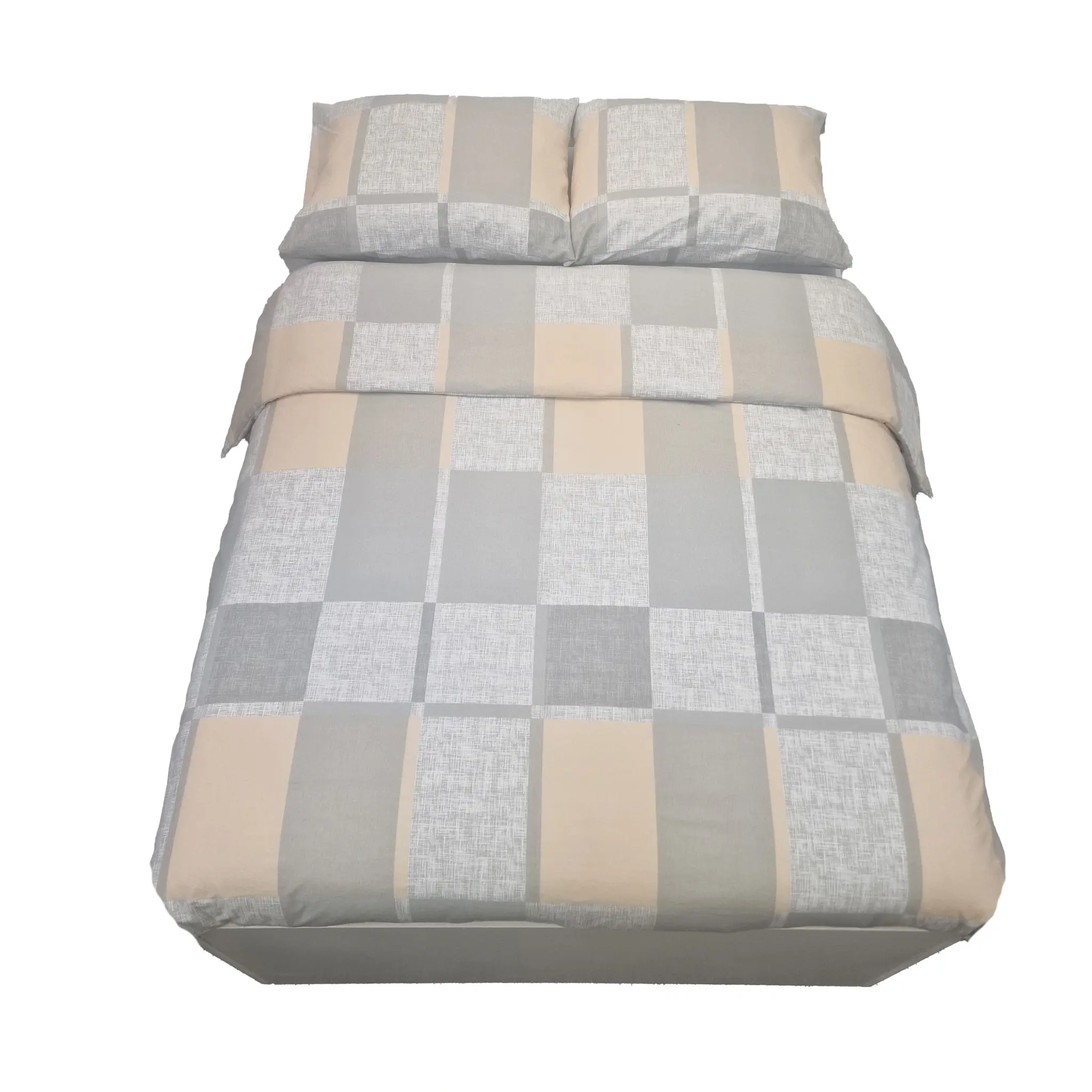 Het dessin Lux is van een heerlijk Flanellen stof gemaakt. Het dessin bestaat uit verschillende vierkante vlakken in pastel kleuren, wit, grijs, licht-taupe en een perzikkleur.
