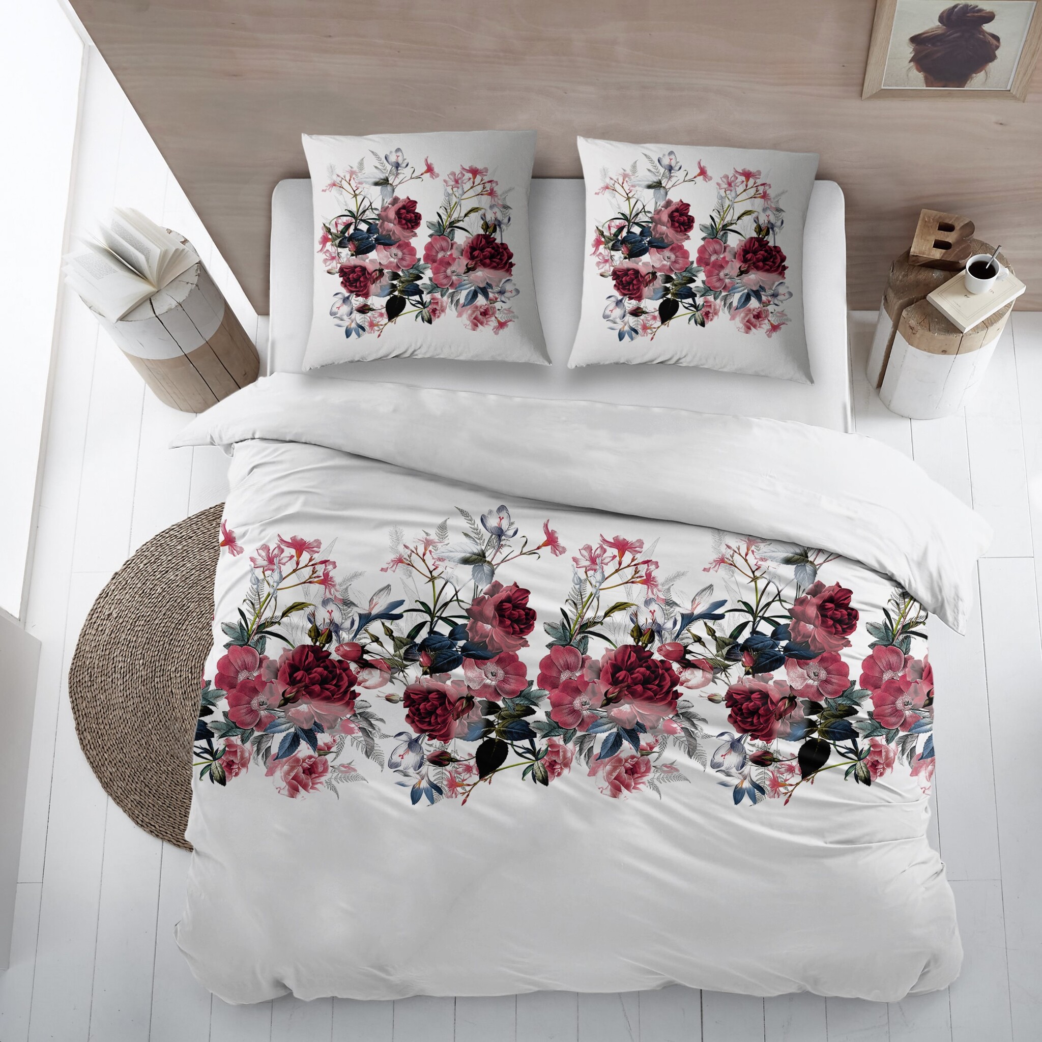 De basiskleur van het dekbedovertrek is wit. De bovenzijde van het dekbedovertrek heeft in het midden een band meet daarop voornamelijk rozen en takken en bladeren.