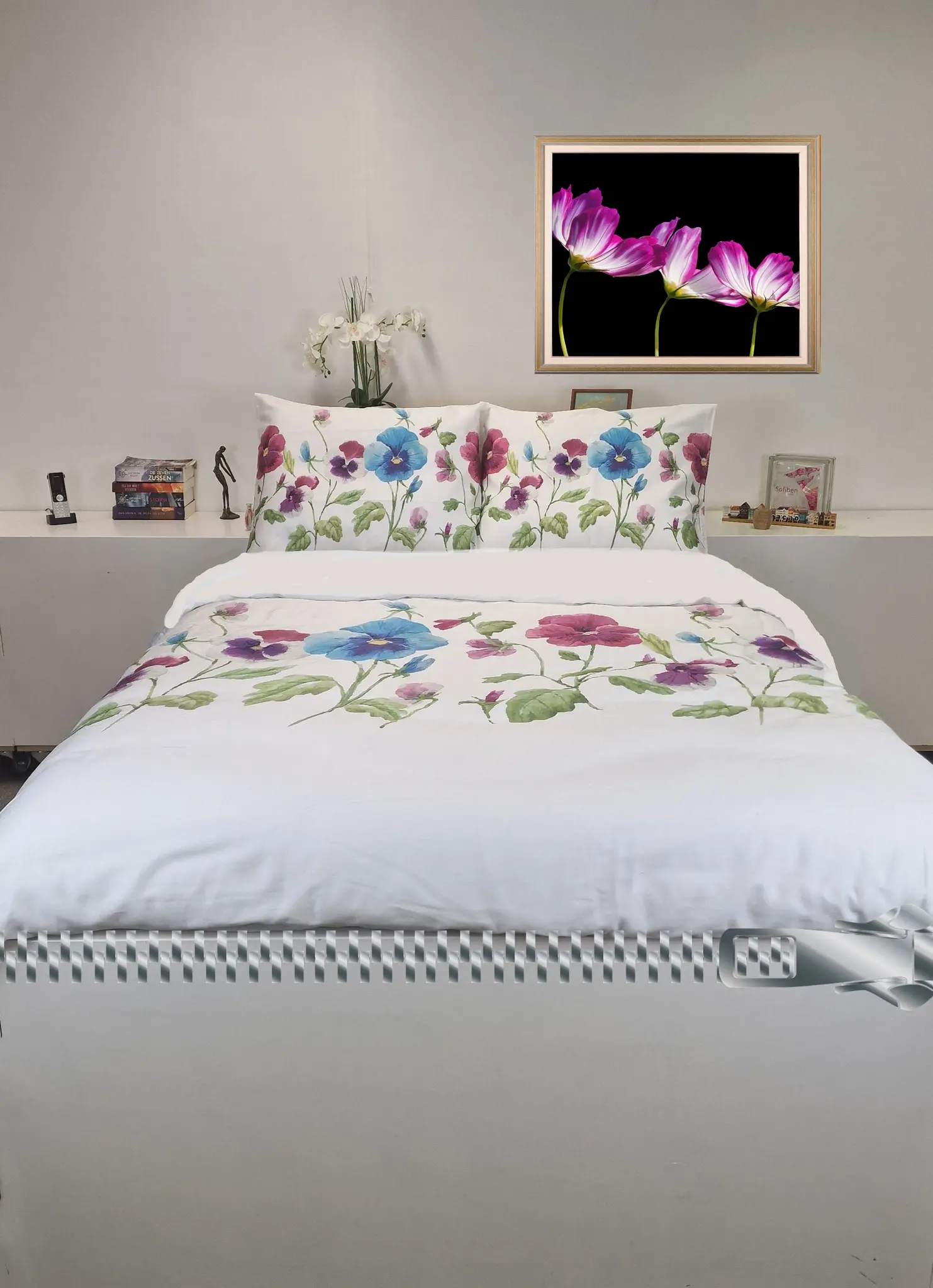 Het dekbedovertrek Summer heeft als basiskleur wit en in het midden voorzien van een brede strook met prachtige bloemen in tweetal kleuren. De onderkant wordt gemaakt van een effen witte kleur.