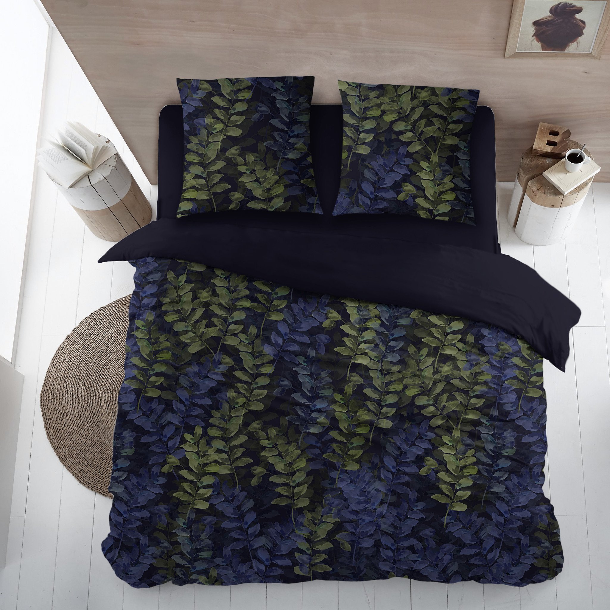 De basiskleur van het dekbedovertrek is overwegend paarsblauw. De bovenzijde van het dekbedovertrek heeft over de gehele oppervlakte verschillende takken met bladeren in de kleuren blauw en groen. De onderzijde is effen paarsblauw van kleur.